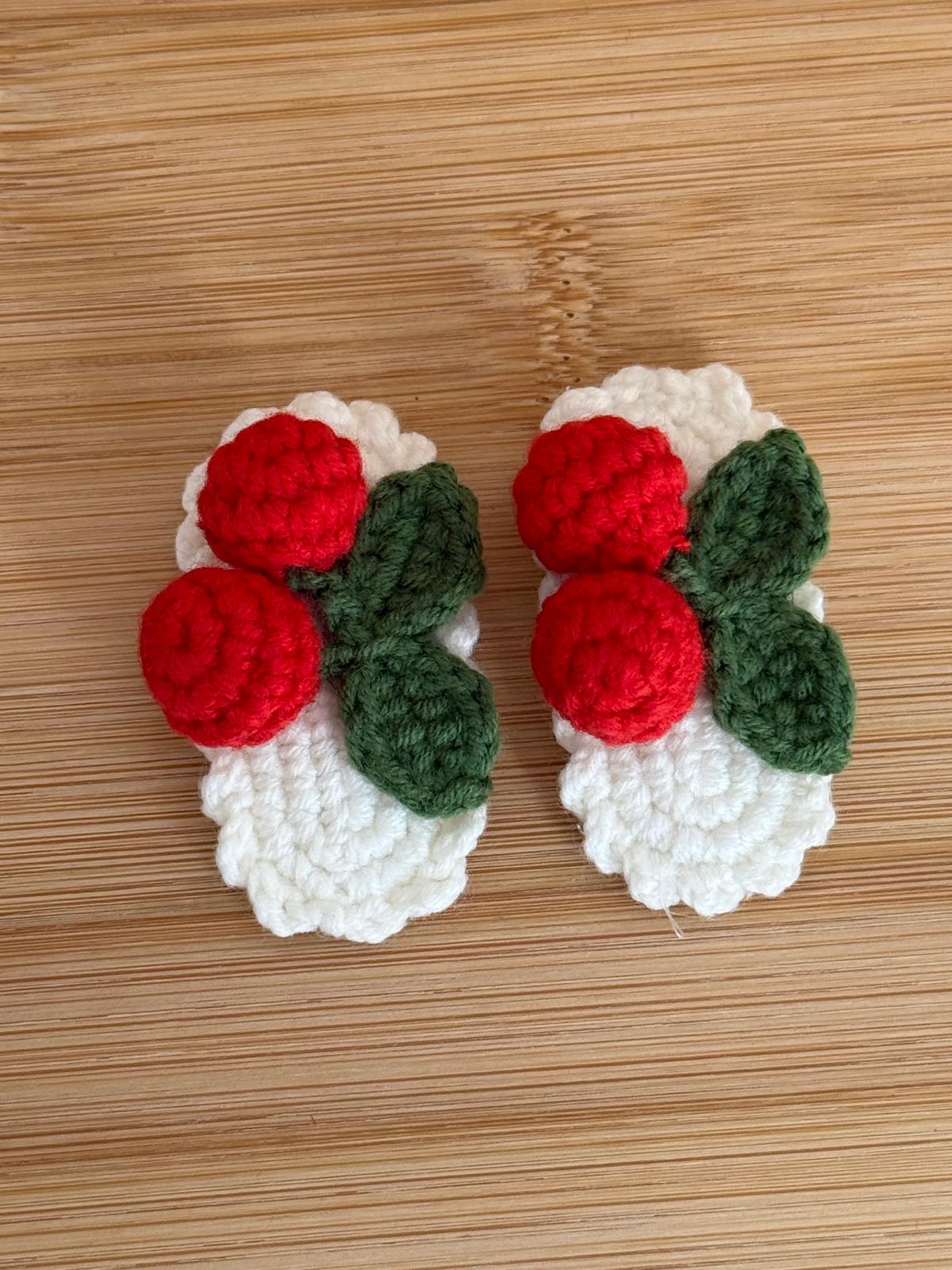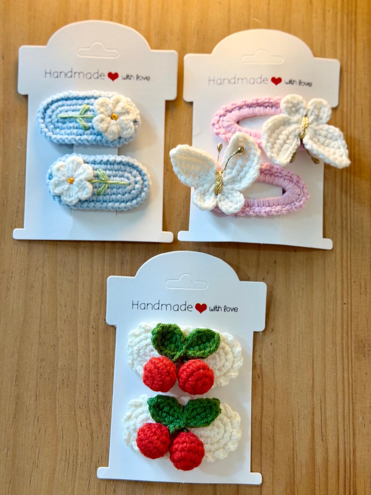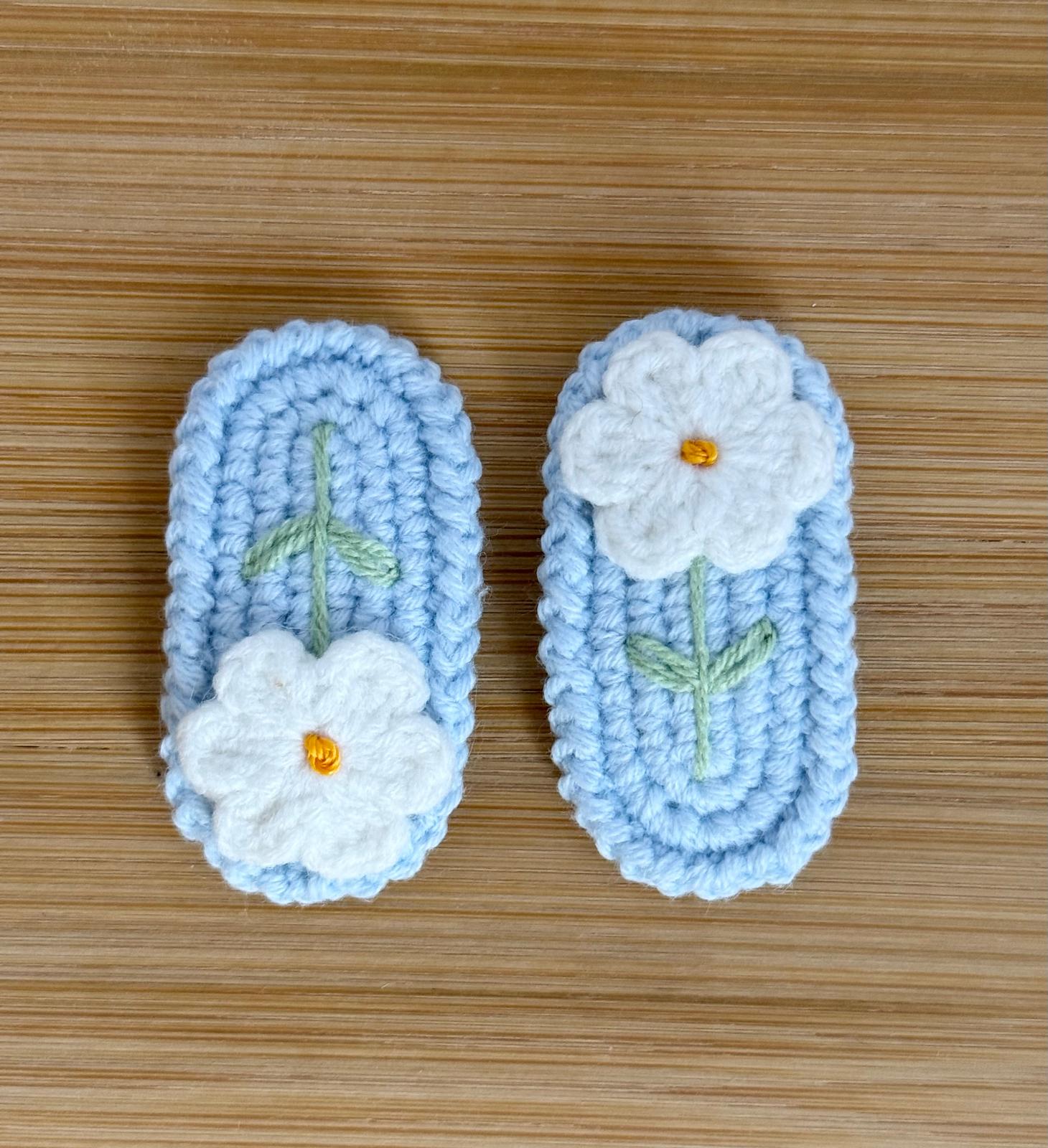 A luxury trio of hand-crocheted snap clips inspired by soft skies and blooming petals .