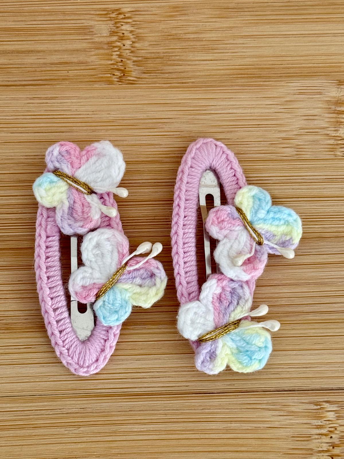 A luxury trio of hand-crocheted snap clips inspired by soft bloom and summer days.