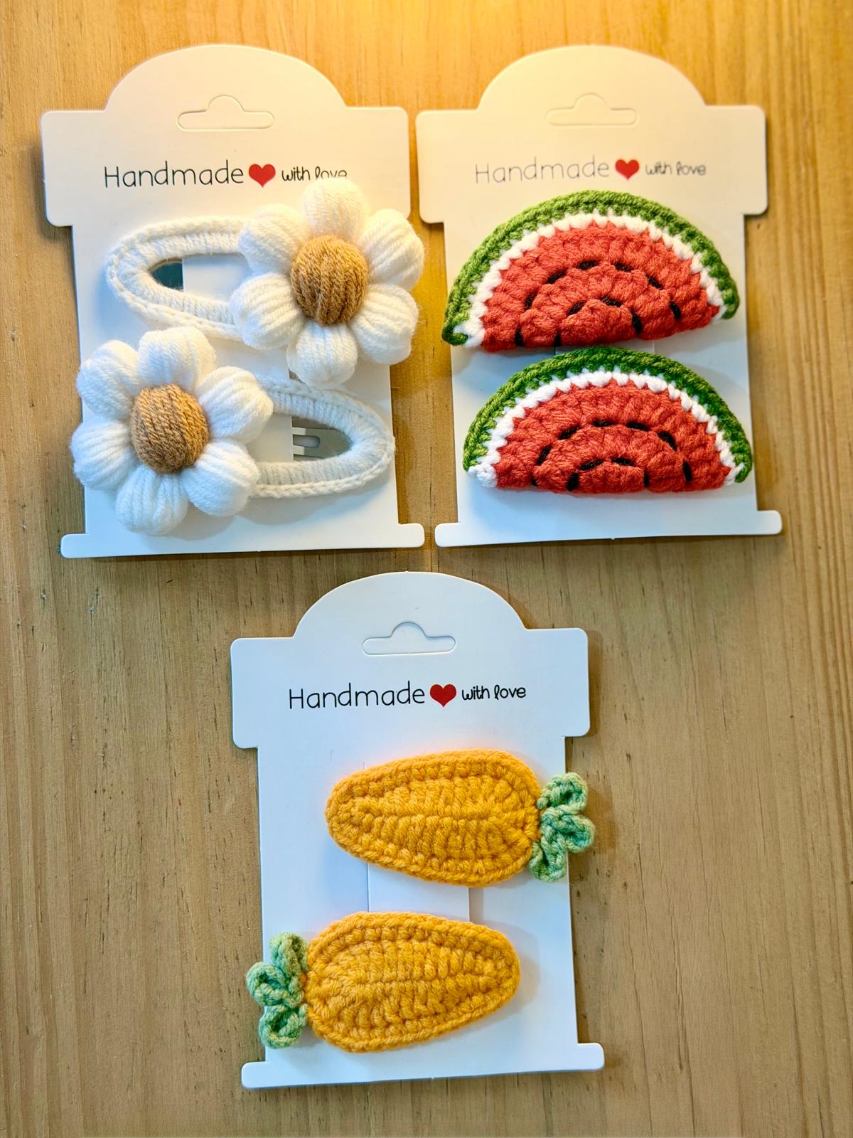 A luxury trio of hand-crocheted snap clips inspired by soft bloom and summer days.