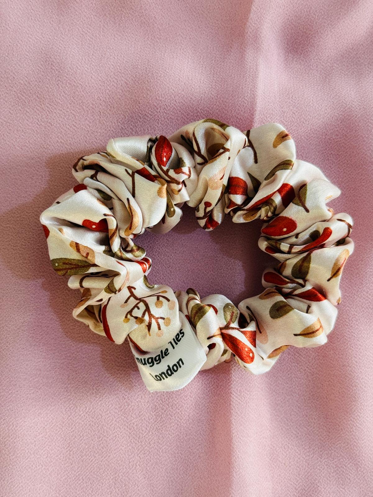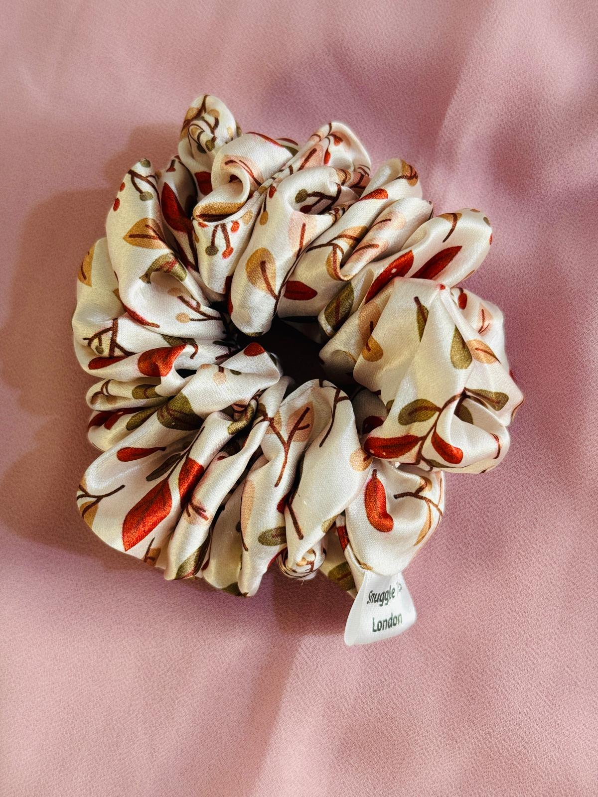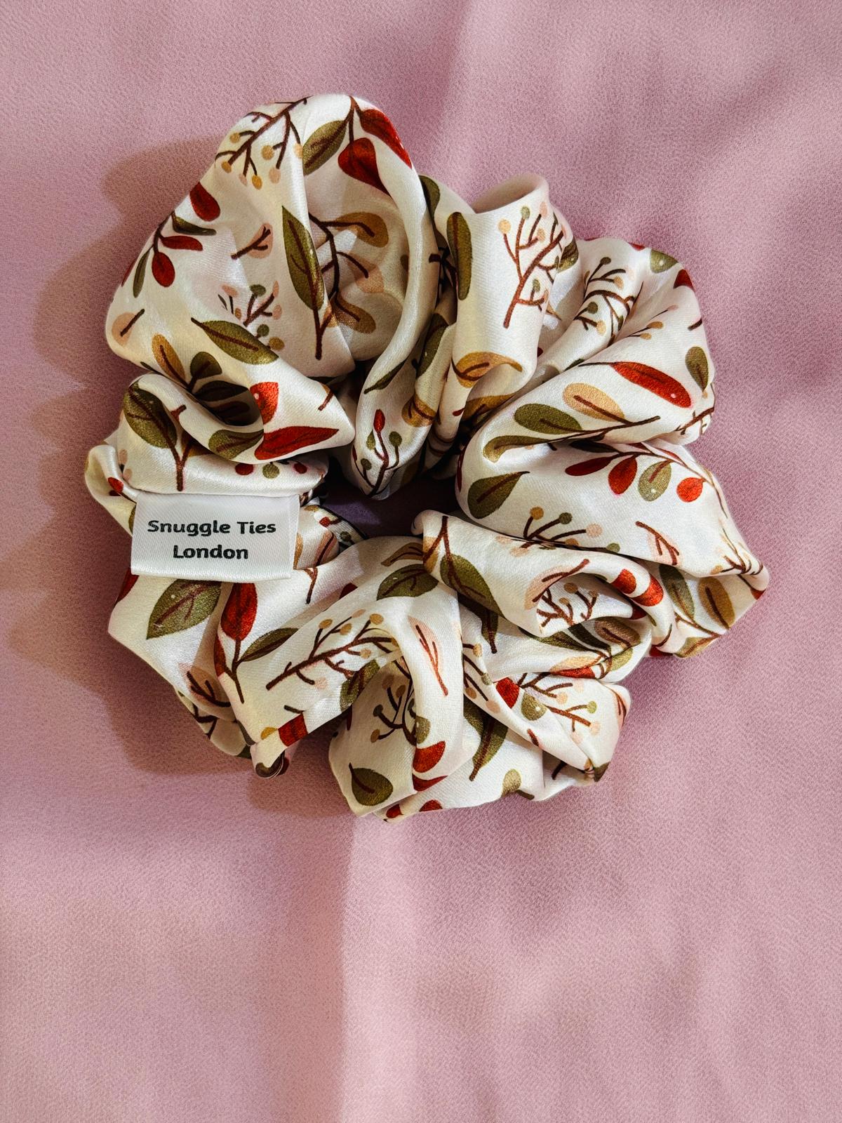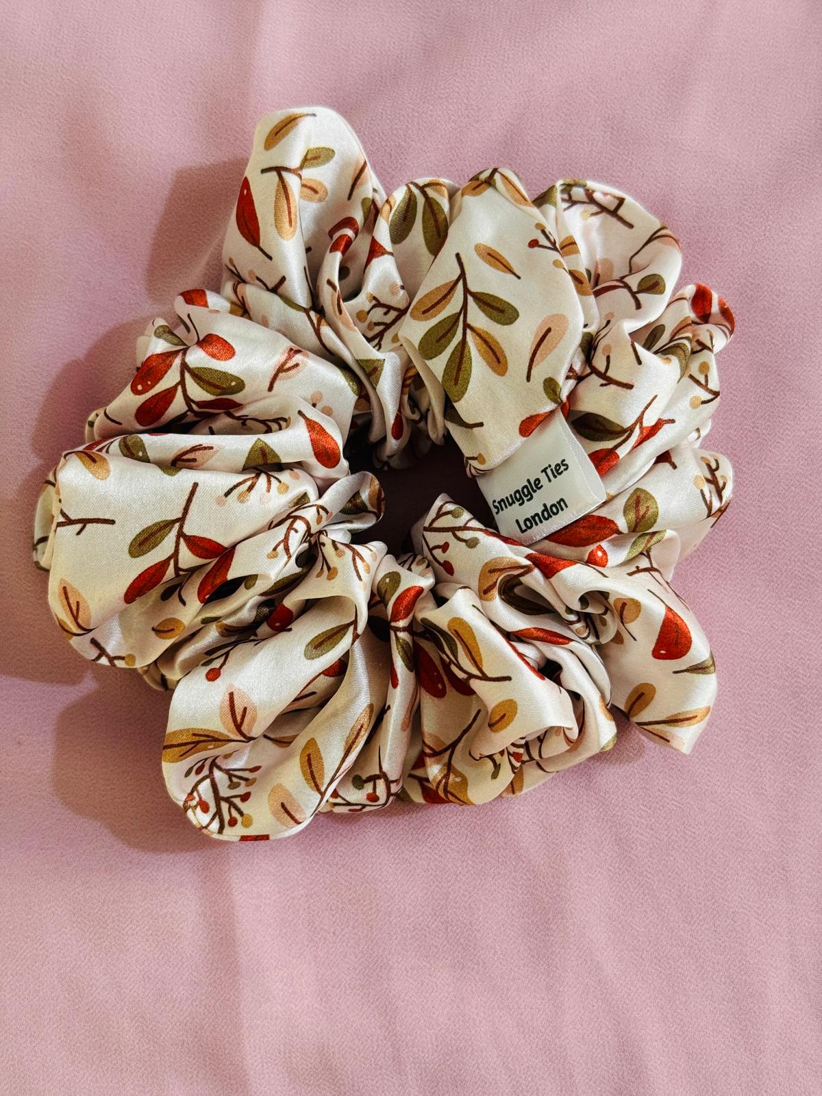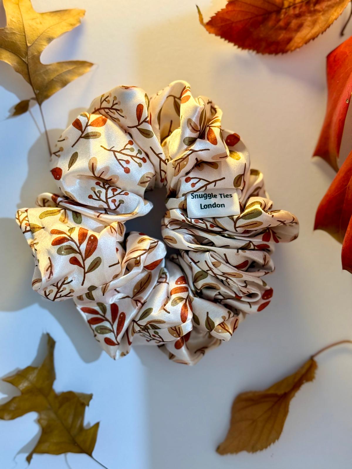 Embrace autumn's quiet elegant with the Falls Vein Scrunchie by Snuggle Ties London. Handmade from luxurious satin. It features a refined print of burnt red and deep green leaves on a soft neutral base.