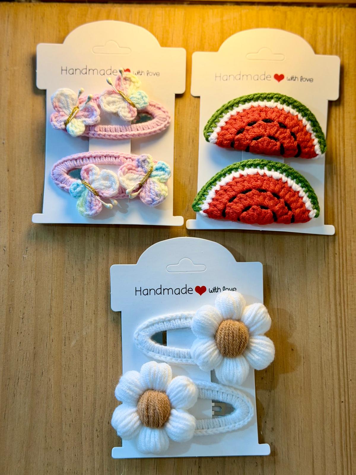A luxury trio of hand-crocheted snap clips inspired by soft bloom and summer days.