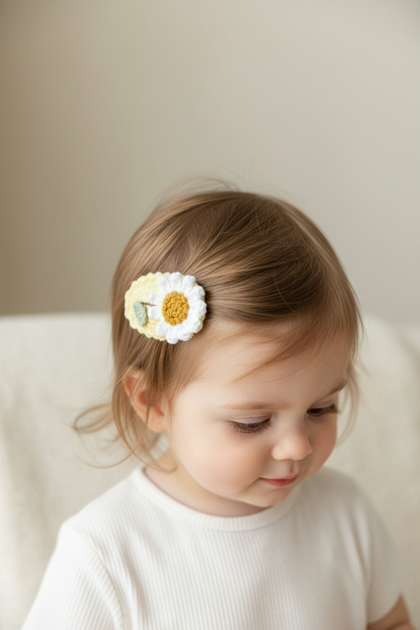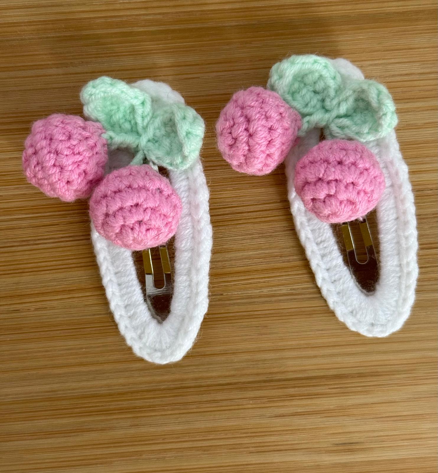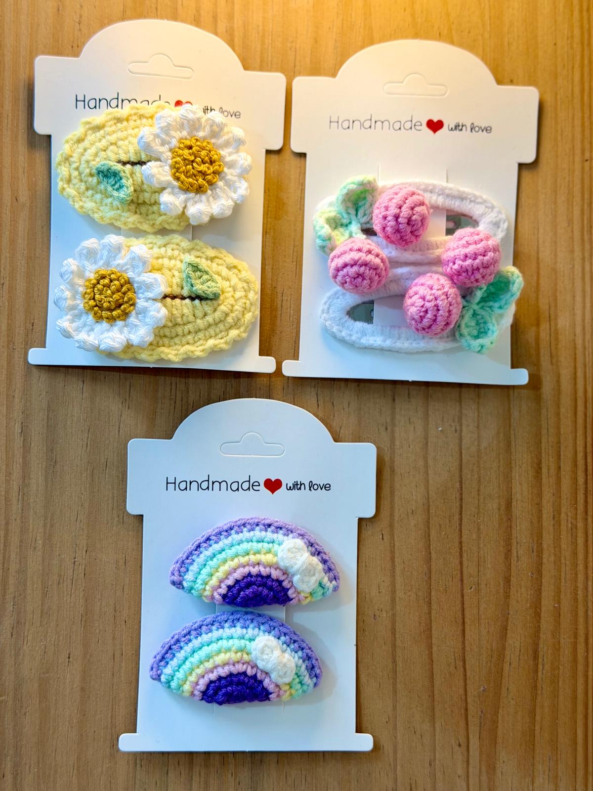 A luxury trio of hand-crocheted snap clips inspired by soft skies and blooming days.