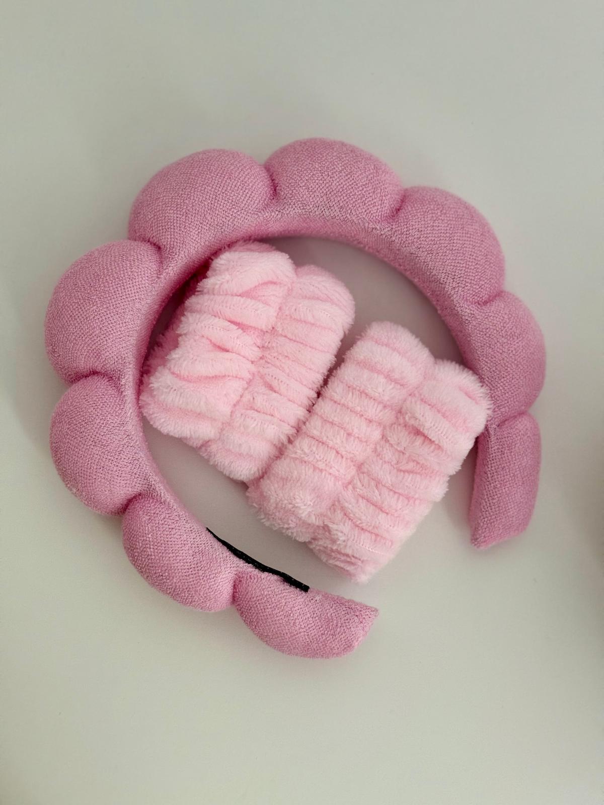 Indulge in pure elegance with our Rose Water spa set, a delicate rose-toned headband and wristband duo handcrafted from plush terry cloth for the ultimate self-care experience. Designed to bring soft luxury to your skincare ritual.