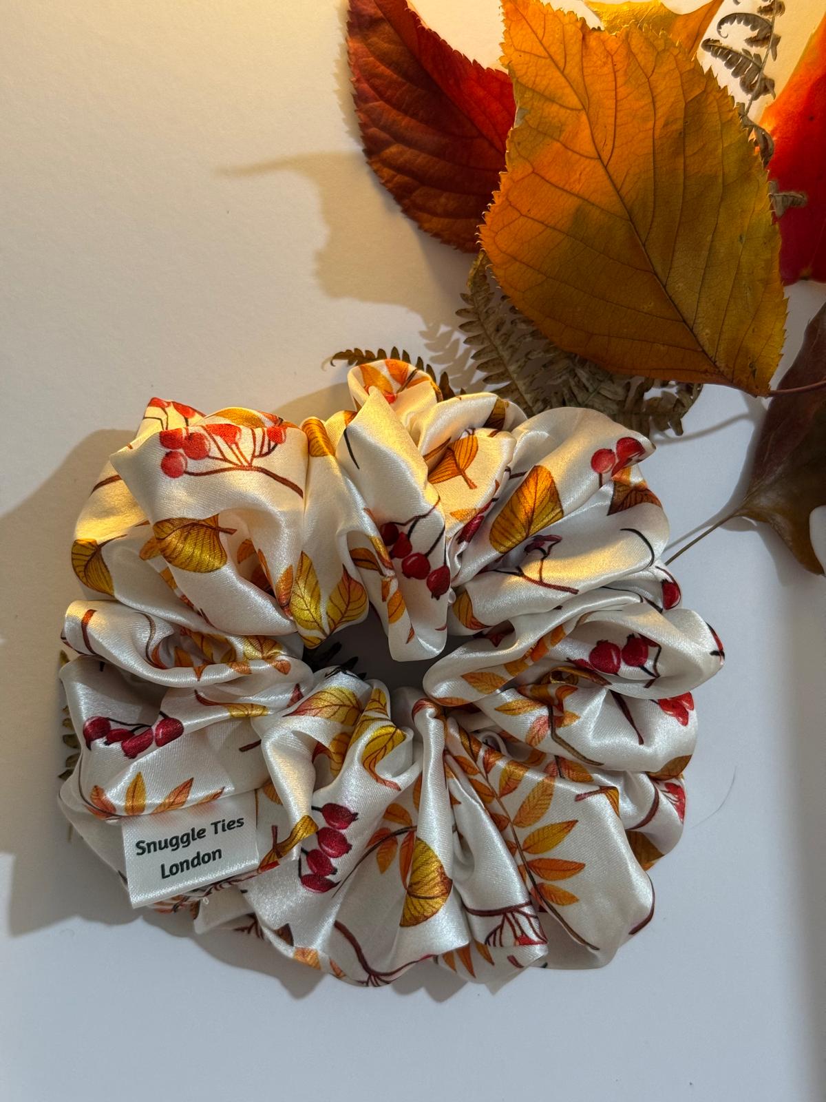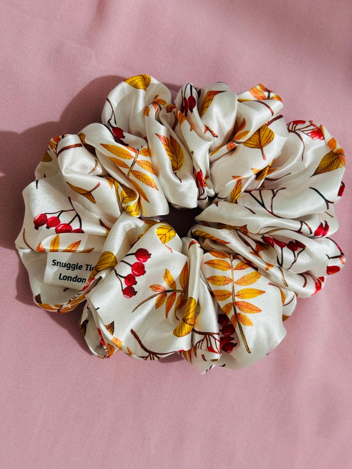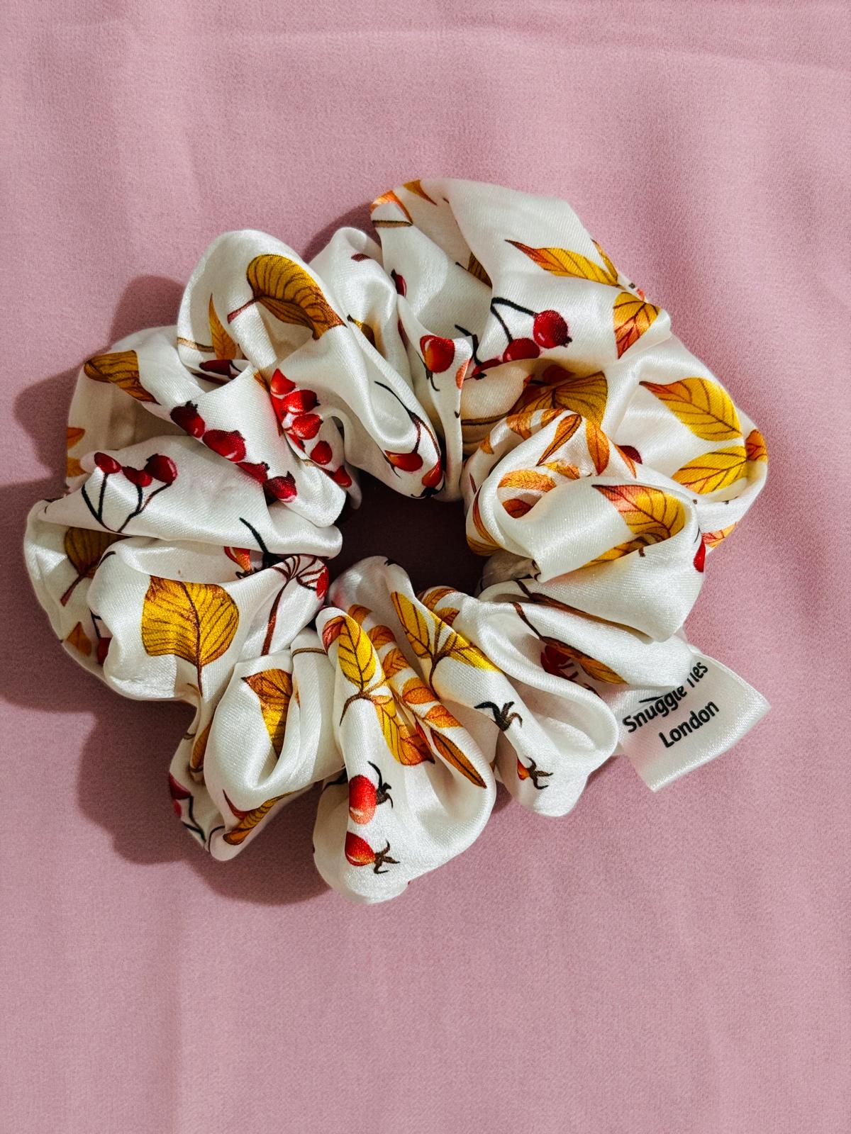 Rust Petal is a celebration of the season's quiet beauty. Featuring a delicate pattern of golden leaves and tiny red fruits, this scrunchie is handcrafted from premium satin for a smooth , gentle hold that protects your hair and elevates your look.