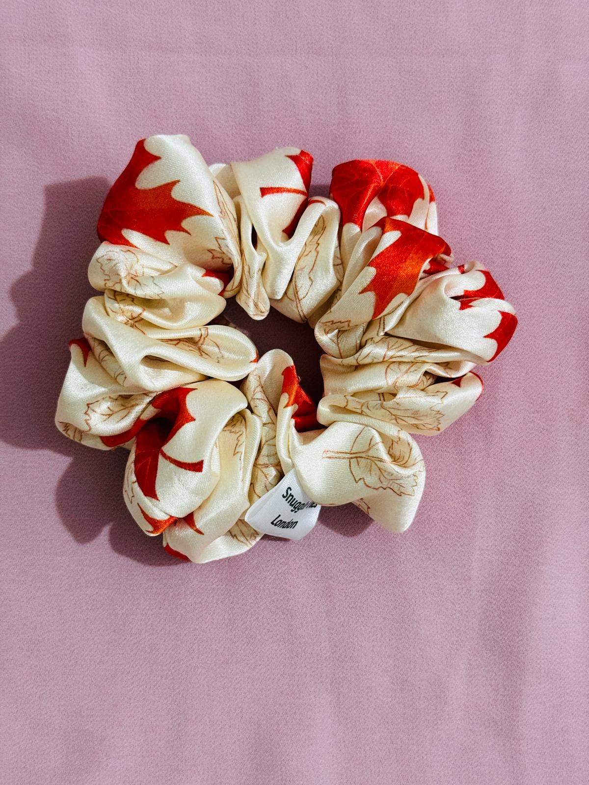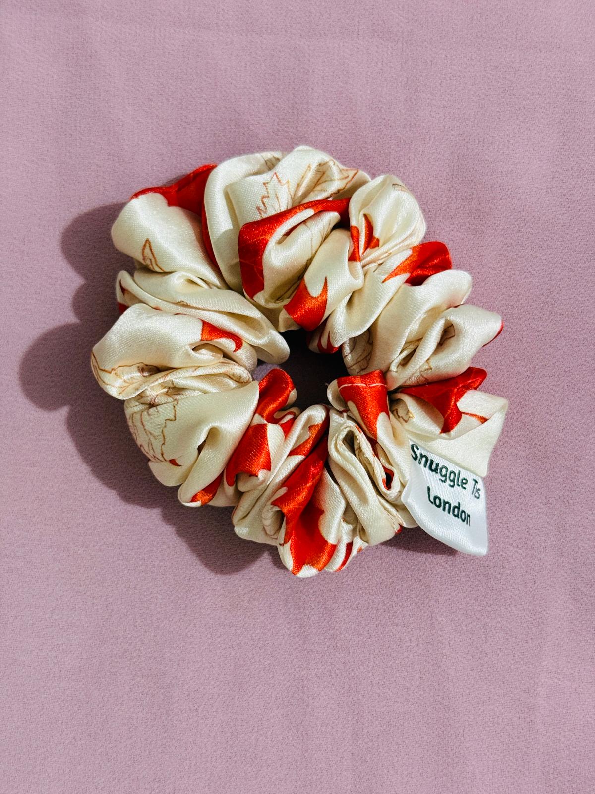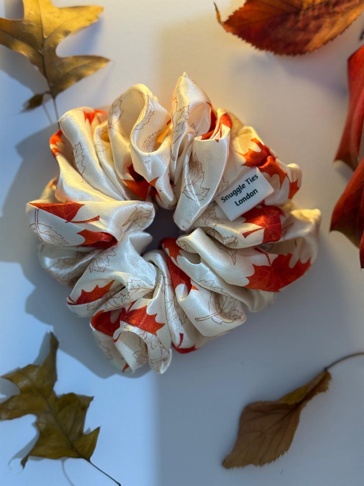 Indulge in understand luxury with the Burnt Sugar Scrunchie by Snuggle Ties London. Handcrafted form buttery-soft satin. This piece features a delicate autumn print of burnt sugar-toned leaves on an off-white backdrop.