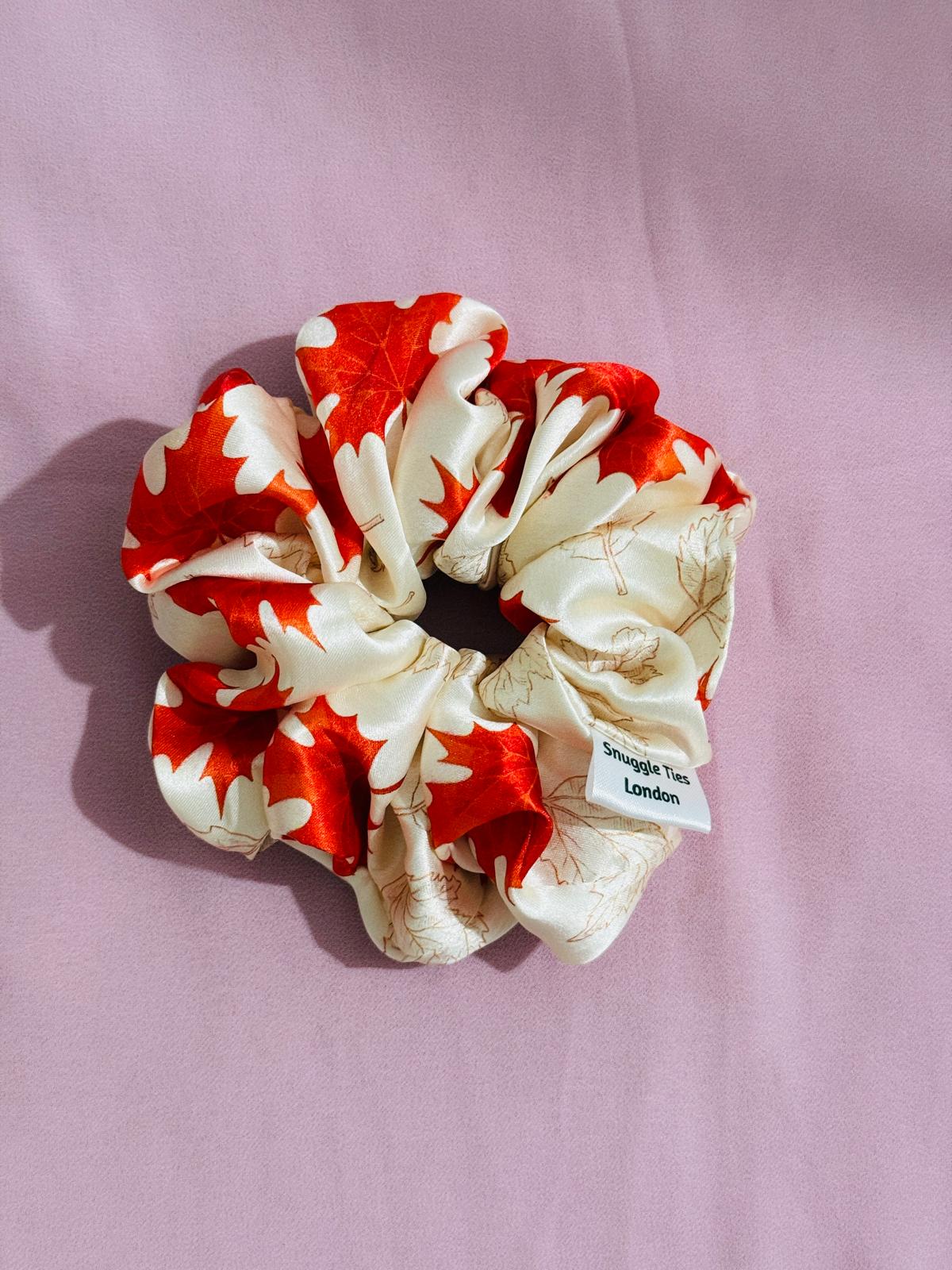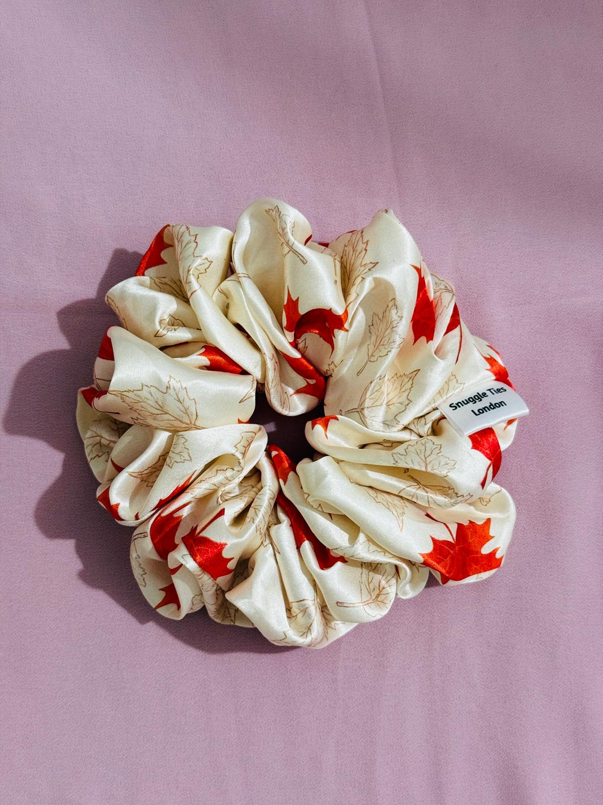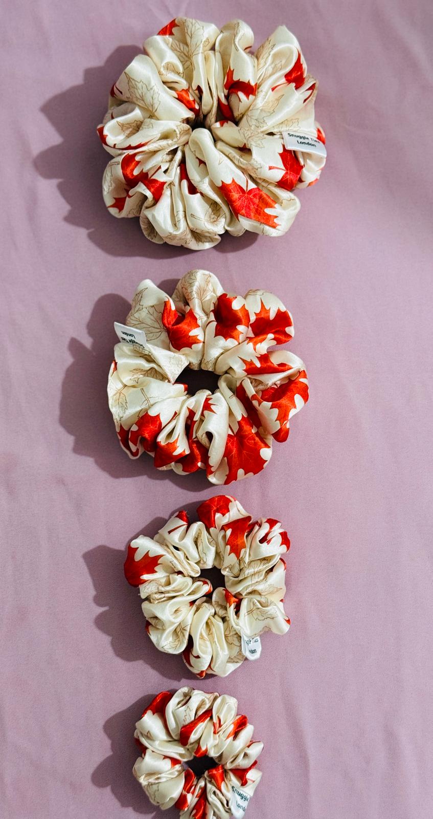 Indulge in understand luxury with the Burnt Sugar Scrunchie by Snuggle Ties London. Handcrafted form buttery-soft satin. This piece features a delicate autumn print of burnt sugar-toned leaves on an off-white backdrop.